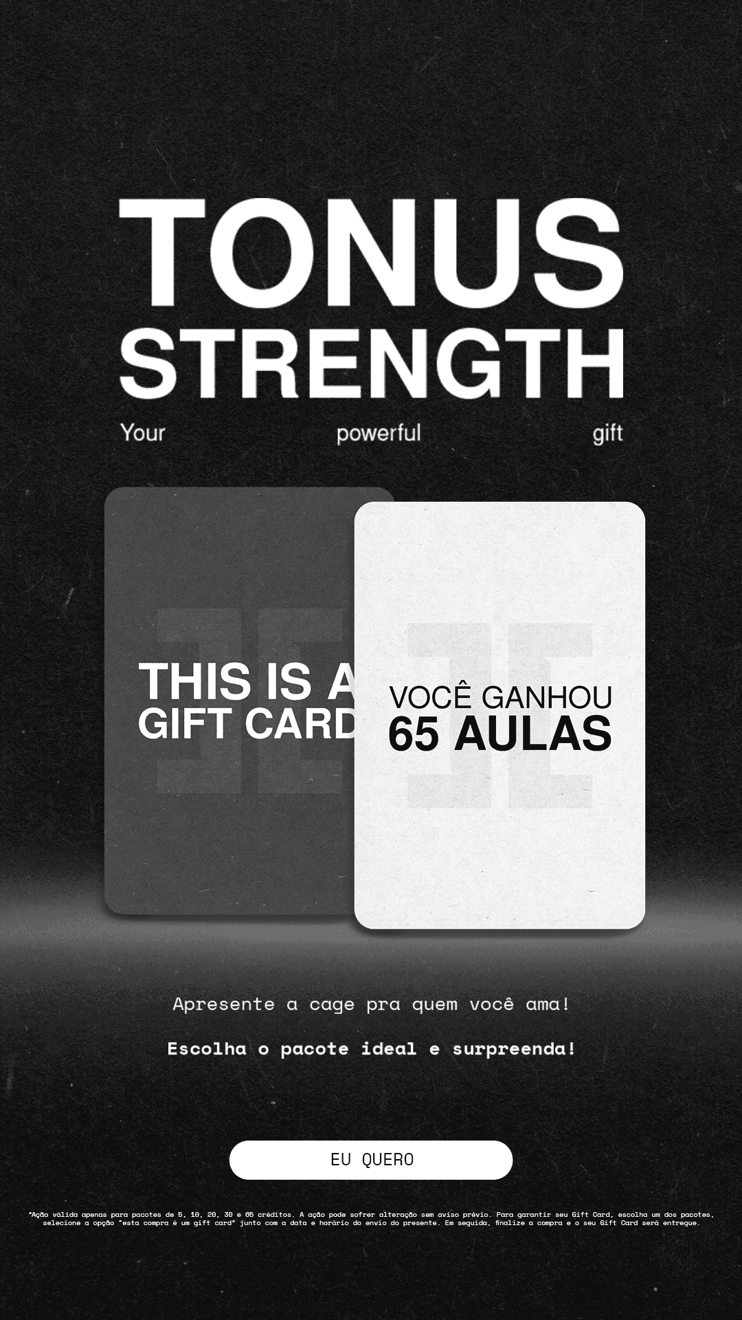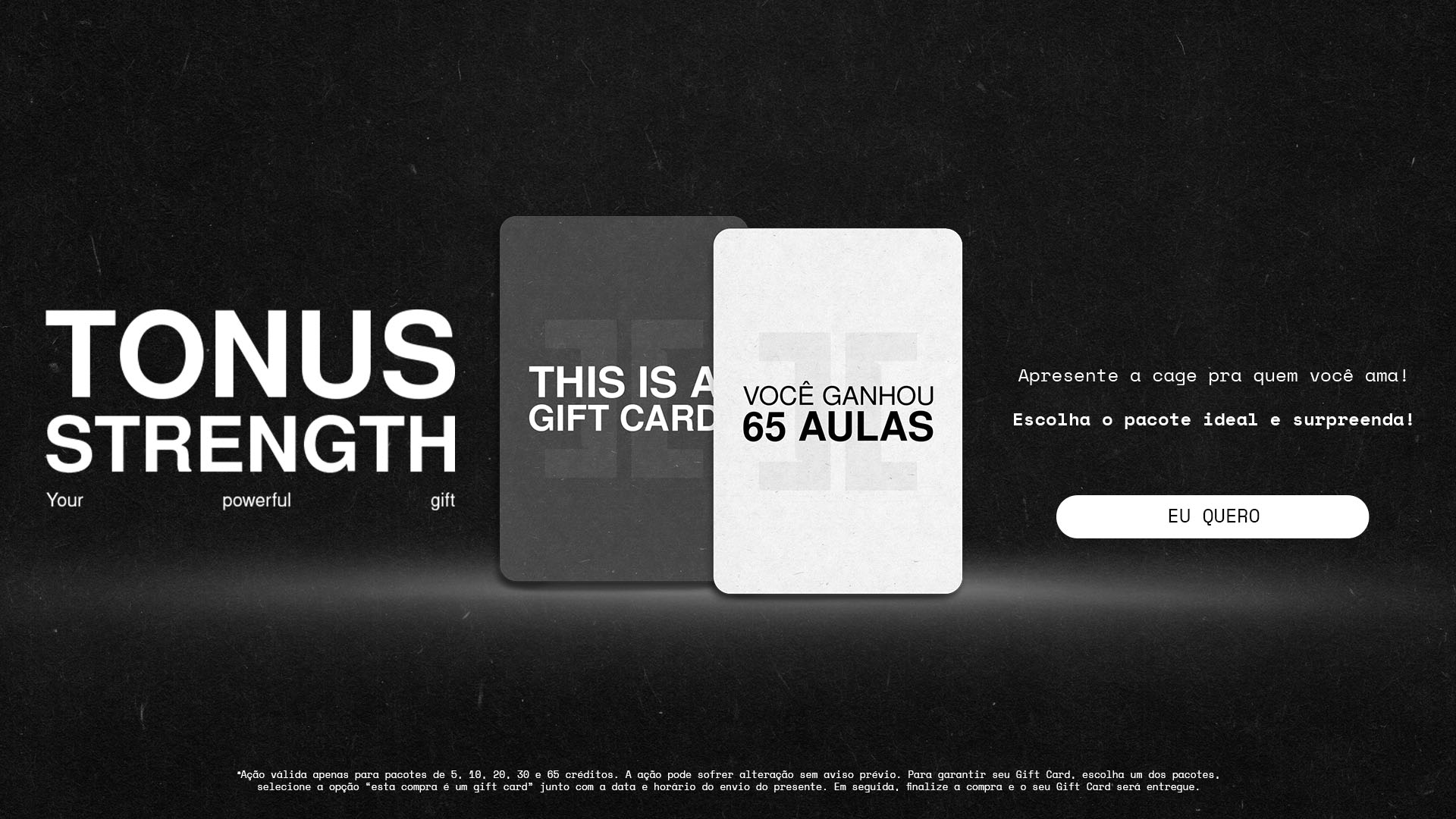 Temos opções para todos os objetivos. Pode escolher o Gift Card com pacotes de 1, 5, 10, 20, 30 ou 65 aulas. Basta selecionar a quantidade desejada no momento da compra.